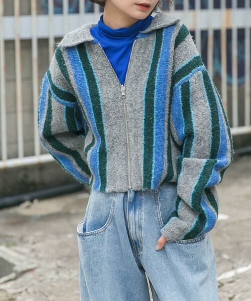 鮮やかなマルチストライプ柄が最大の魅力。スタイリングを華やかにしてくれる存在感抜群ニット。ショート丈且つボックスシルエットは、どんなボトムにも合わせやすい。また、フロントZIP仕様なのでトップスとしてだけでなく、羽織としても活躍します。