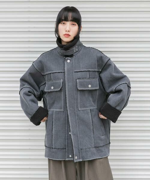 デニム・フェイクレザー・ツイルの3素材をカラーごとに変えたボンディングジャケット。裏地はボアになっており、カットオフや袖の折り返しデザインが抜け感を演出します。腰回りがすっぽりと隠れる丈感や、ハイネックにも変えられる仕様もこだわりのポイント。モード感を出しつつ防寒対策も叶うアイテムです。