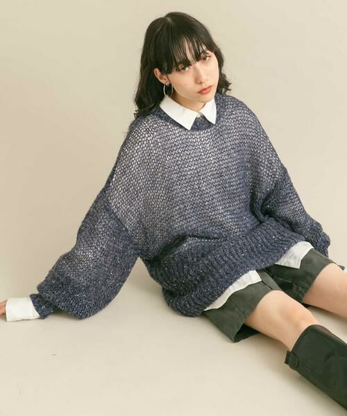 トレンドのスパンコールの糸を使用し、存在感を高めた透かし編みニット。身体のラインを拾い過ぎないオーバーサイズも◎袖口と裾は透けないように編みを変えることでメリハリを出しました。レイヤードスタイルにおすすめの1着です。
