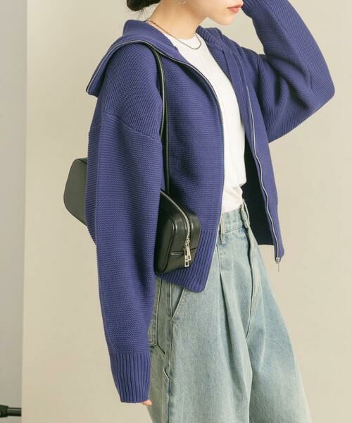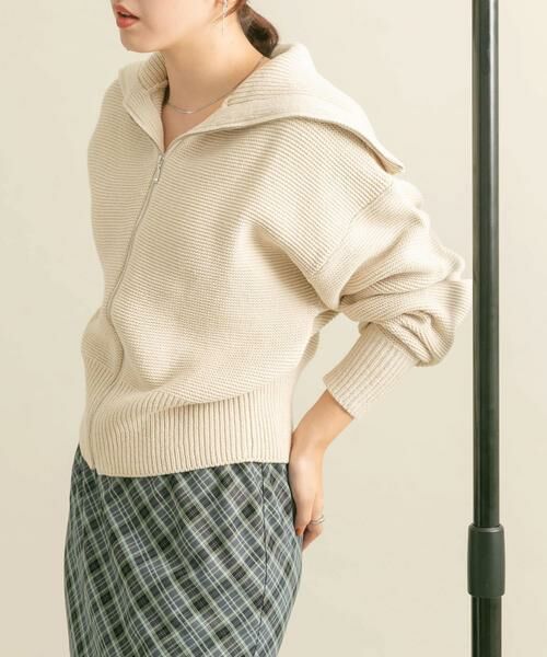 セーラーカラーデザインが存在感を放つ、トップス使いや羽織としても着ていただけるニット。メインとしてはもちろん、ジャケットのインナーにもできるよう少しコンパクトに仕上げました。ZIPの開き具合で襟元の表情に変化を与えてくれ、大人カジュアルコーデにおすすめしたいアイテムです。