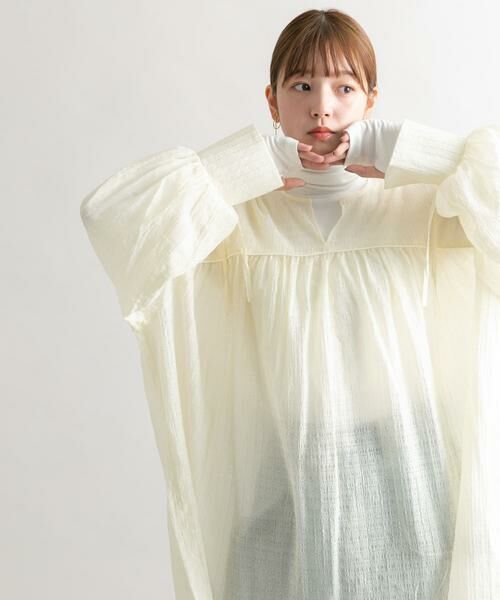 表情のある素材と透け感が特徴的なミニワンピース。袖口のカフス上にドローコードが付いており、ぎゅっと絞るとボリュームを出すこともできます。また、軽い着心地なので暑い時期から着ていただけ、インナーをレイヤードするとロングスパンの活躍が期待できます。
