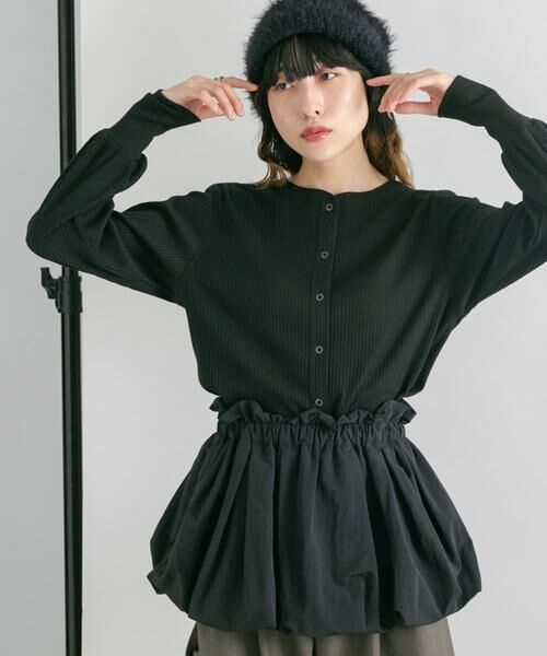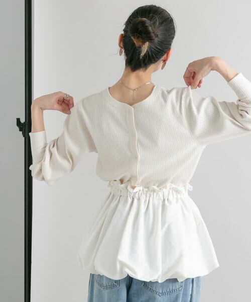 ベーシックなリブトップスとバルーンパーツがセットになったお得なアイテム。トップスは着やすい素材とリングドット釦がポイント。前後で着用可能なところもこだわりました。パーツはワッシャー感のあるナイロンを使用し、レイヤードしやすいようにゴムを入れました。気分に合わせて何通りものスタイルが叶う1着です。