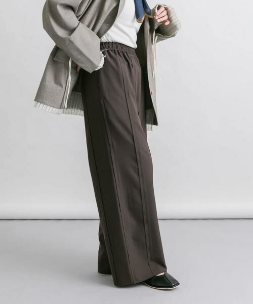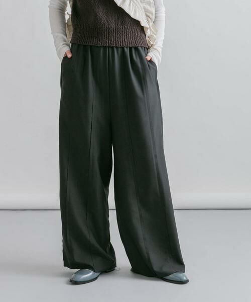 ウエストぐるりゴム仕様で、リラクシーな履き心地が期待できるパンツ。一見ベーシックに見えますが、切替部分を断ち切り仕様に仕上げました。ワイドシルエットでメンズっぽさも演出してます。合わせるアイテム次第でロングスパン活躍する1本です。