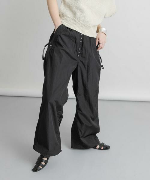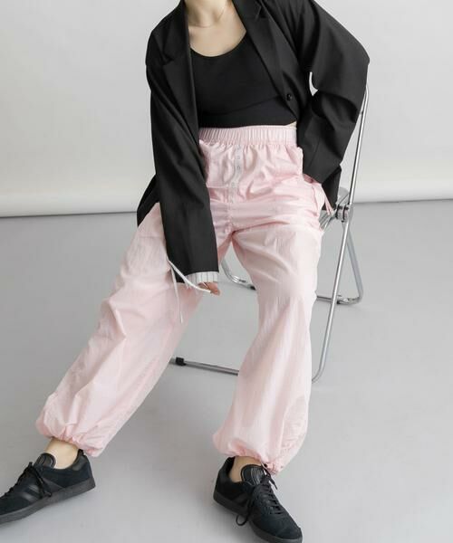 さらっとした薄手のナイロン素材を使用したパンツ。ウエストはぐるりゴム仕様でリラクシーな穿き心地が叶い、裾はドローコード付きなのでシルエットの変化も楽しめます。また、フロントのリングドットテープやポケットのジップなどさりげないこだわりが盛りだくさんなアイテムです。