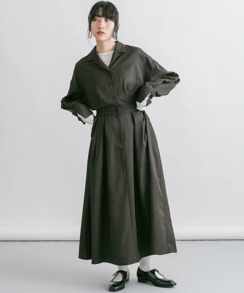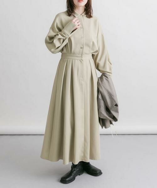 少し落ち感のある生地を採用した、1枚でサマになるワンピース。ウエスト部分にベルト切替が設定されており、シャツとフレアスカートがドッキングしたデザインに仕上げました。襟はオープンカラーながらも襟下に釦が付いているので、上まで留めることも可能。腰回りは後ろゴムなので着やすく、ブラウジングしていただくと程良い抜け感が叶います。
