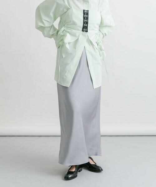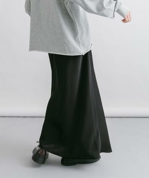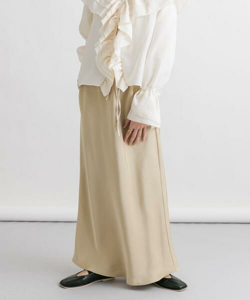 少し落ち感のある生地を使用した、程良い光沢があるサテンスカート。ウエストとヒップ周りはすっきりとしつつ、後ろゴム仕様で楽に穿いていただけます。裾に向けて広がる自然なラインのナローシルエットが女性らしさを引き上げてくれる1着です。