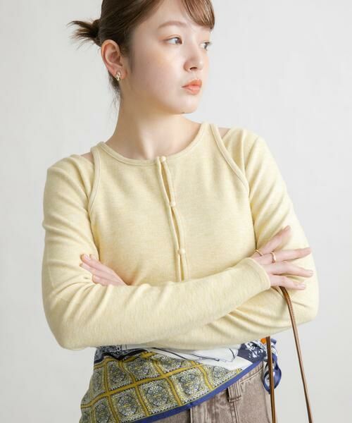 女性らしい広めに設定されたボートネックトップスと、コンパクトなサイズ感且つフロント開き仕様のベストがセットになったアイテム。肌触りの良いパイル生地を使用しています。重ねて着るとさりげない肌見せが叶います。セット着用はもちろん、単品使いも可能な万能な1着。