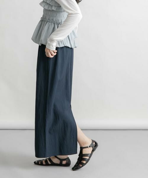 穿いていただくと綺麗なシルエットが叶うIラインスカート。着脱が楽な後ろゴム仕様で、ウエストの小さなダブルボタンがさりげないです。足捌きの良いスリットもポイント。タックイン・アウトどちらもサマになる1着です。