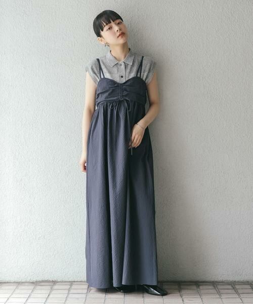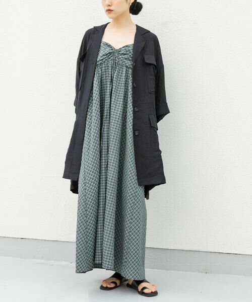 少し表面感のあるチェック柄素材を採用したキャミワンピース。アジャスター付きの肩紐は2本使いになっており、簡単に華奢見えが叶い、様々な身長の方に着ていただけます。また、裾に向かってサイドに入れた切替部分がバイアスになっているところもこだわりのポイントです。ウエストの切替が高めに設定されているのでスタイルアップ効果もあり、胸元のビスチェディテールも女性らしさをUPさせます。合わせるインナー次第で色んな着こなしが楽しめます。