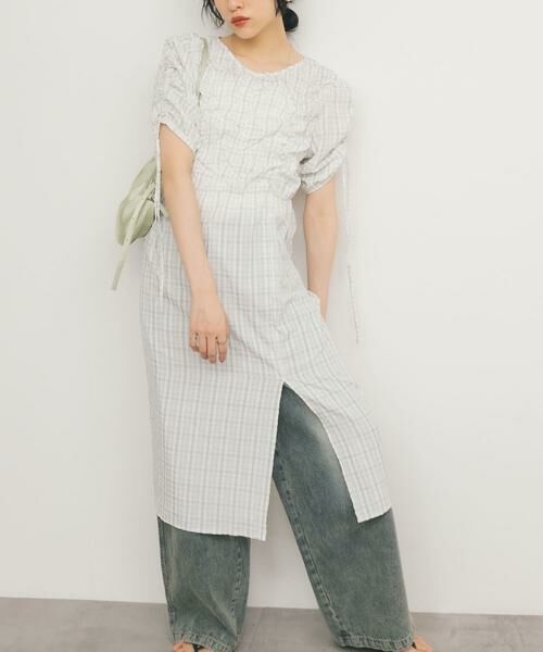 少しシャリ感のあるチェック柄を使用したレディな雰囲気にぴったりなワンピース。身頃部分にランダムシャーリングを施し、袖山に入ったドロスト仕様もポイントです。Iラインシルエットなので、すっきりと見せつつ可愛らしさも兼ね備えた1着に仕上げました。