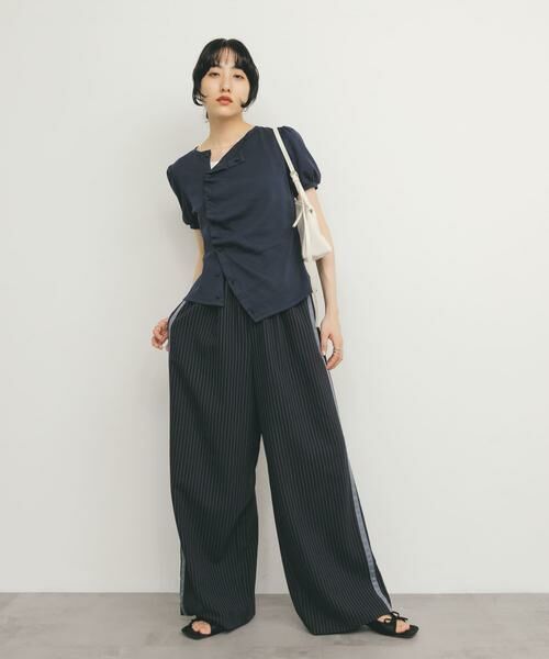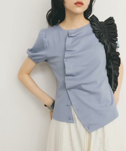 フロントのアシンメトリーデザインが特徴的なカットソー。左右で着丈を変えており、釦を閉めていただくとタックのようなデザインになります。女性らしいパフスリーブや、くるみ釦もポイント。ボリュームボトムと相性が良く、下の釦を2つほど開けて着ていただくのがおすすめです。