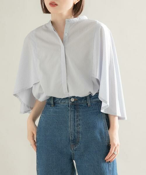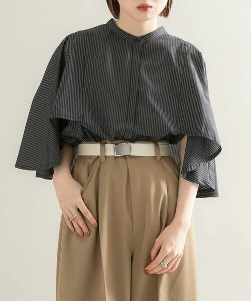 マントのようなバックシルエットが特徴的なデザインシャツ。前から見るとケープのようなデザインになっており、二の腕カバーが叶います。涼し気なピンストライプ柄で仕上げており、さらっとした素材は夏にもぴったりです。タックイン・アウトどちらもできるので、合わせるアイテム次第ではONコーデも期待できます。