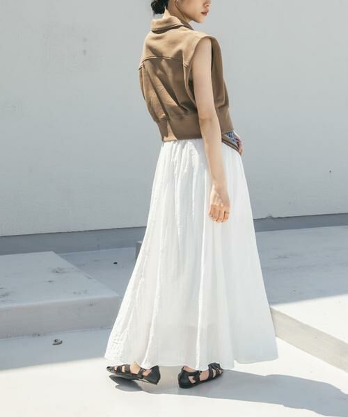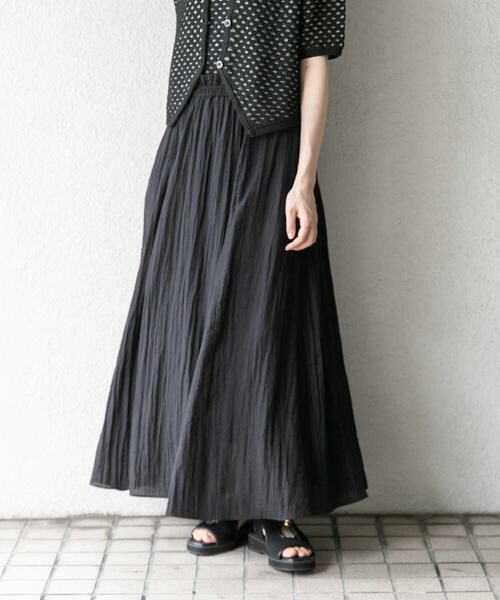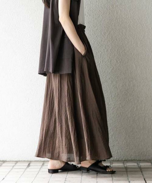 ワッシャー感のある素材を使用したスカート。ウエストはゴムになっているので楽な穿き心地が叶います。ウエストギャザー仕様になっていながらも、腰回りにボリュームが出すぎないよう調整したり、ウエスト端にフリルを挟み込んだりと、さりげないこだわりが詰まっています。