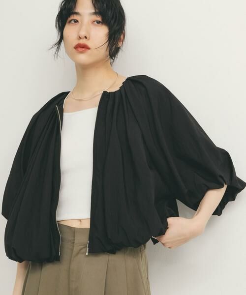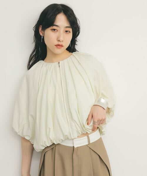 バルーンシルエットが大人可愛いジャケット。襟ぐりにタックを入れ、肩は膨らみすぎないよう調整しました。フロントZIPとポケットを付けることで、ほっこりしすぎないようなデザインに仕上げています。さらっと羽織れるので、持っておくと便利な1着です。