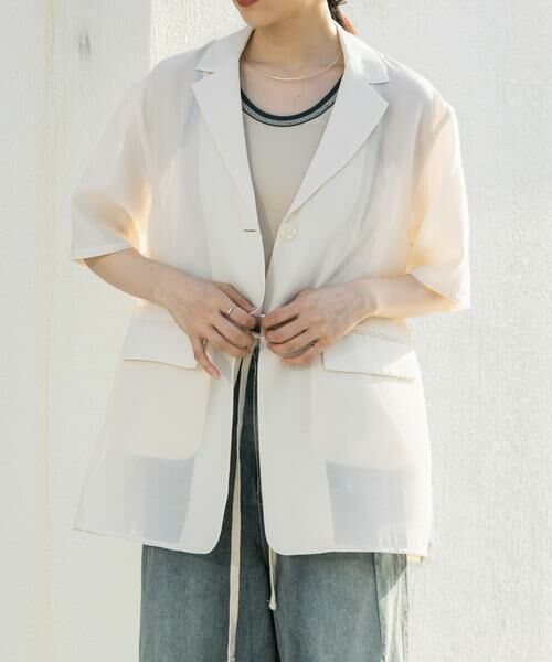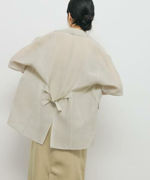 微光沢感と少しハリのあるオーガンジーで仕上げたハーフスリーブジャケット。程よい透け感が上品なので大人カジュアルに着ていただけ、シャツ感覚で羽織れる軽い素材も嬉しいポイント。シンプルなディテールながら、バックスタイルはベルトが付いているので、細身シルエットにもチェンジできます。持っておくと万能なアイテムです。