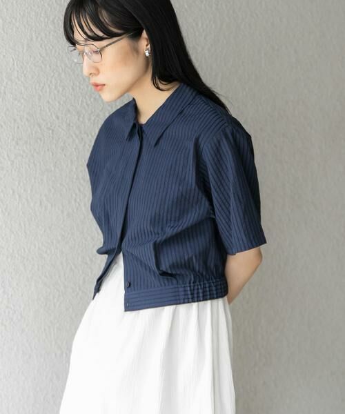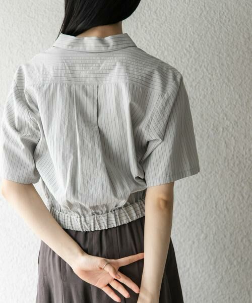 モード感のあるスタイルにしてくれるストライプシャツ。後ろの裾をゴム仕様にすることで、ウエスト部分がきゅっと締まって見え、ショート丈なサイズはスタイルアップを叶えます。二の腕をカバーしてくれるデザインも嬉しいポイントです。