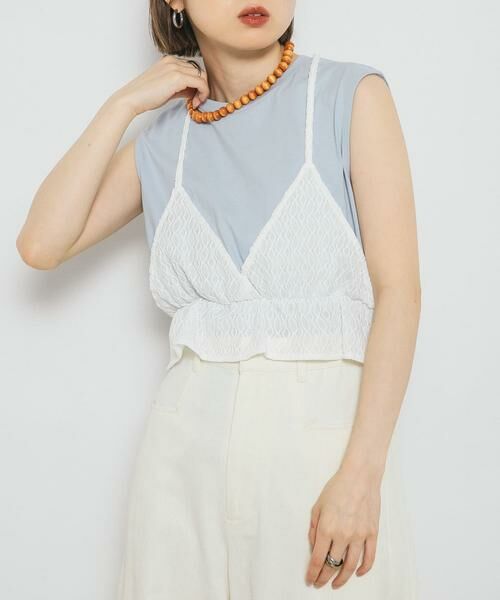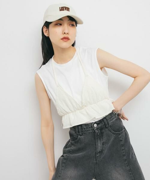 【タンクトップにビスチェをドッキングさせたデザイントップス】ベーシックなタンクトップにブラビスチェパーツをドッキングさせたトップス。レイヤードしているかのようなデザインになっており、切り替え部分にゴムを入れることで、少しウエストがきゅっと締まって見え、スタイルアップが叶います。COORDINATE少しフェミニンなアイテムなので、カジュアルなデニム合わせがイチオシです。CAPや小物合わせも加えるとよりこなれ感が増します。【2025 Spring/Summer】【25SS】※商品画像は、光の当たり具合やパソコンなどの閲覧環境により、実際の色味と異なって見える場合がございます。予めご了承ください。※商品の色味の目安は、商品単体の画像をご参照ください。▼お気に入り登録のおすすめ▼お気に入り登録商品は、マイページにて現在の価格情報や在庫状況の確認が可能です。お買い物リストの管理に是非ご利用下さい。