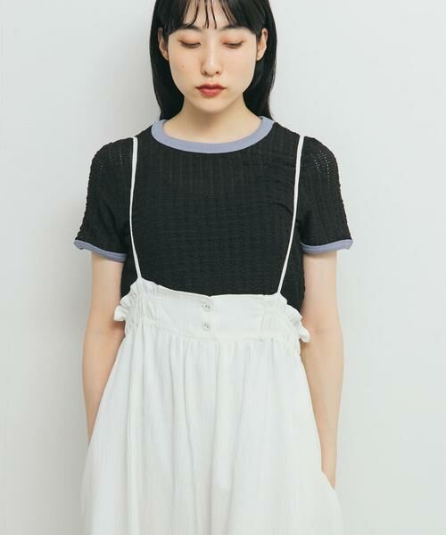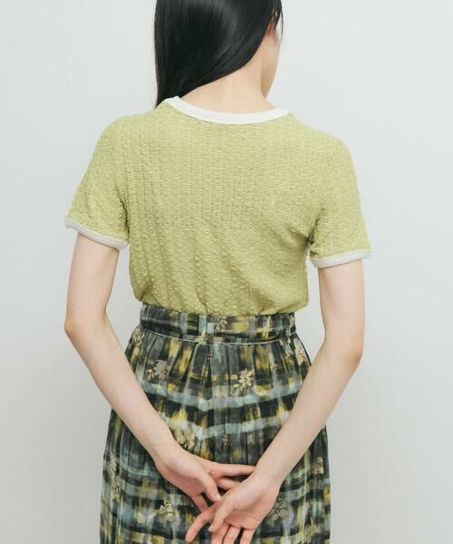 フリルレースのようなポコポコとした素材感が特徴的なトップス。少しフェミニンな雰囲気を持ちつつ、襟と袖口のバイカラーパイピングがスポーツMIX感のある1着に仕上げました。コンパクトなアイテムなのでボリュームのあるボトムと相性抜群です。