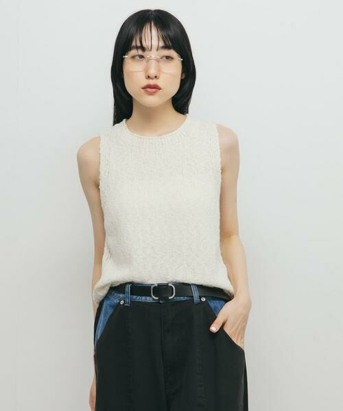 ポコポコとした表面感のあるブークレ糸を使用したニットタンクトップ。コンパクトなサイジングで、ヘルシーなアメリカンスリーブ仕様に仕上げました。1枚着はもちろん、薄手のトップスの上からレイヤードした着こなしもおすすめです。