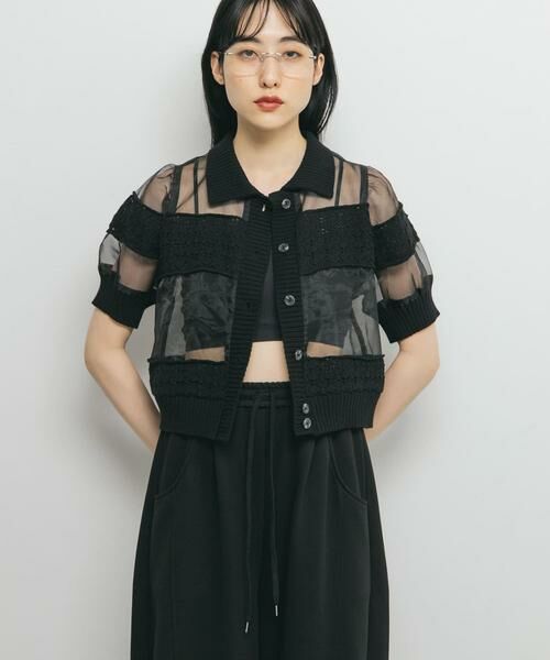 ボディの生地にオーガンジー素材を使用し、ボーダーの上にニットをドッキングさせたデザインが特徴的なトップス。カジュアルコーデにもマッチしやすいよう、襟や前立て、袖口はリブ仕様にしました。程よくコンパクトな着丈はハイウエストボトムと相性が良く、デニムのみならずスラックス合わせもぴったり。前の釦を開け、ジャケットのように羽織る着こなしもおすすめです。