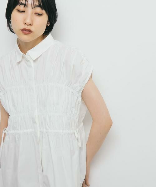 フロントのデザインシャーリングが特徴的で、肩にかけてギャザーがたっぷり入っているので程よく二の腕をカバーしてくれます。ウエスト部分はドロスト仕様になっており、少し絞って調整も可能です。ベーシックボトムに合わせるだけでさりげない存在感を放つ1着です。