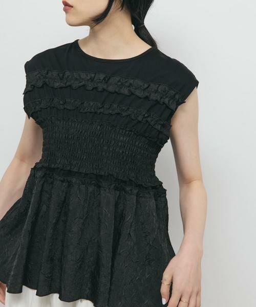 カットソーに表面感のあるブラウスをドッキングさせたトップス。胸元のプチフリルやウエストのシャーリングでフェミニンな印象に仕上げました。さらっとした素材なので着心地が良く、気になる二の腕をカバーするフレンチスリーブもポイントです。