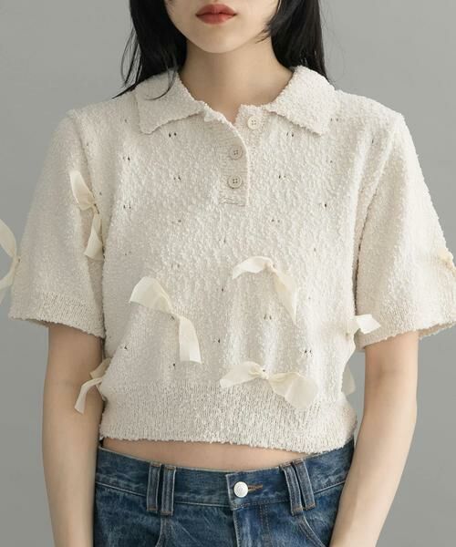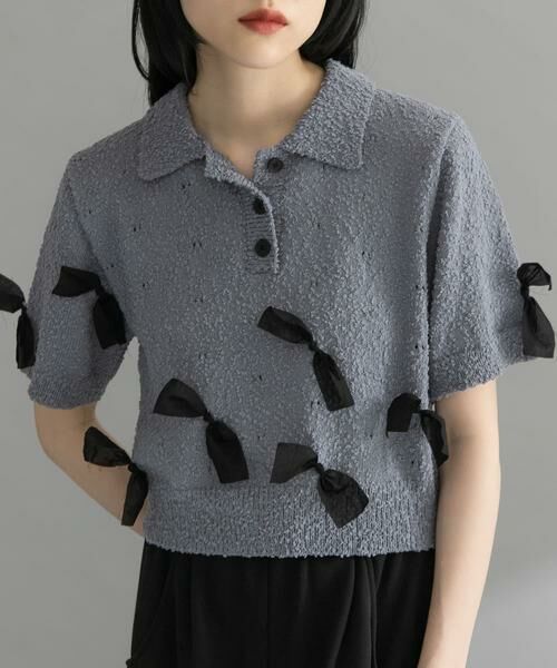 夏でも着ていただきやすい厚みのブークレ糸を使用したシャツカラーのニット。散りばめられたリボンモチーフが特徴的で、1枚で着映えるアイテムに仕上げました。ボリュームのあるボトムとバランス良く合わせられるように、コンパクトなサイズ感にしました。IVORYは同色のリボンにし、GRAYは黒リボンと雰囲気が異なるところもポイントです。