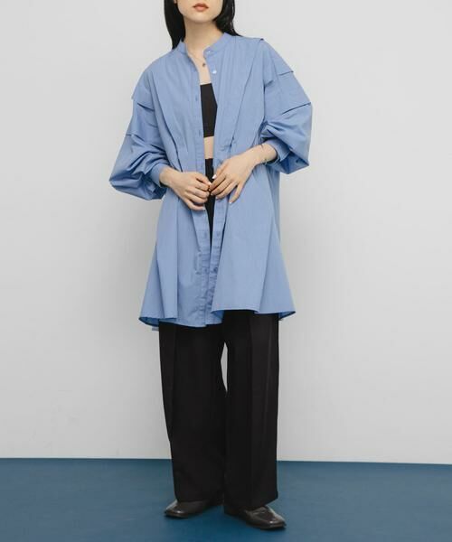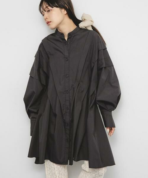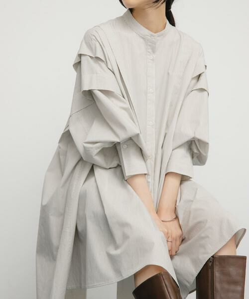 肩からウエストにかけて入った大きなタック仕様が存在感を放つミニワンピース。バックスタイルも施しているので、どこから見ても抜かりないデザインが魅力です。二の腕や腰回り、気になる箇所をカバーしてくれるサイジングになっており、着心地が良い綿を含む素材もポイントです。ボリュームがあるので、細身のボトムを穿き、さらっと羽織として着るとバランス良く仕上がります。前の釦を全て閉じミニワンピースとしても着用可能です。