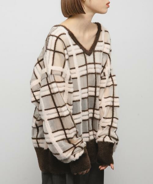 大胆なチェック柄は存在感を放ち、シアー糸とフェザー糸を使用した特徴的な素材感がポイント。デコルテがすっきり華奢見えするようVネックを採用し、腰回りを程よくカバーする着丈にもこだわりました。ベーシックボトムに合わせるだけで華やかさを演出し、合わせるインナー次第で異なる雰囲気も楽しめる1着です。