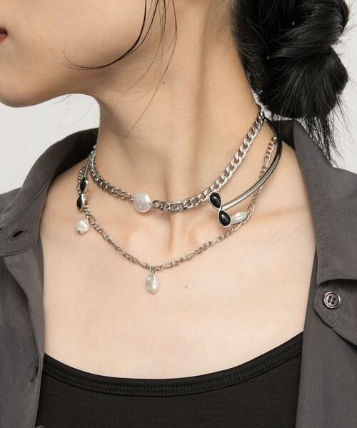 黒のエポキシ樹脂の付いたチョーカーと、樹脂パールの付いたチェーンチョーカー、淡水パールが付いたチェーンネックレスがセットになったアイテム。重ね使いはもちろん、セパレートでも使用いただけます。