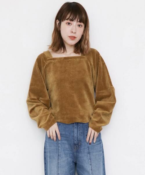 コーデュロイのようなカットソー素材を使用した秋冬らしさ漂うトップス。デコルテを綺麗に見せるスクエアネックが◎身頃はすっきりとさせつつ、袖には程良いボリュームを与えたメリハリのあるデザインも魅力的ですね。女性らしい仕上がりなので、デニムを合わせてもカジュアルになり過ぎずにまとまります。