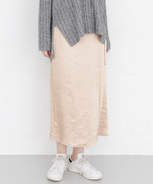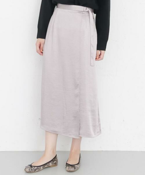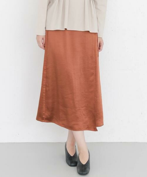 いつものスタイリングに変化を与えてくれるサテン仕立てのスカート。ラップ風に見えるデザインや、甘さ控えめの緩やかなシルエットも魅力のひとつ。あえてカジュアルなアイテムを合わせるのはもちろん、ニットとの異素材MIXコーデを楽しむのもオススメです。
