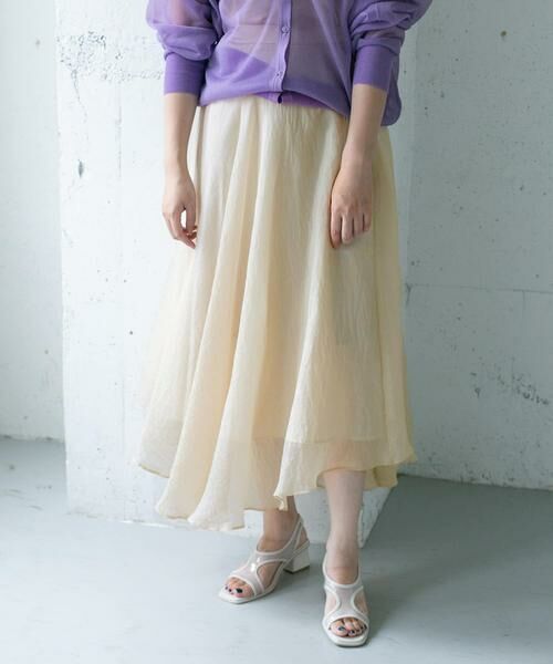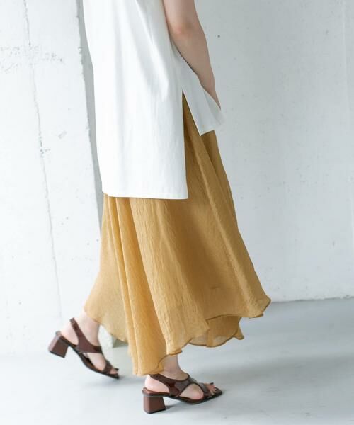 歩くたびに揺れるシルエットが目を惹くイレヘムスカート。スタイリングに軽やかさを与えるシアー素材で仕上げました。広がり過ぎないのでボリュームのあるスウェットやロングシャツとのバランスも取りやすい、ワードローブにあると重宝する万能アイテム。季節を感じるカラーリングにも注目です。※この製品はデザイン上、モノフィラメント糸を使用しています。糸の特性上、ザラザラした肌触りがあり、肌に触れますと赤くなる場合があります。特に肌が弱い方や汗をかきますと顕著になります。直接肌には着用せず、下に1枚着用することをおすすめします。また、着用して肌に異常を感じた場合は、直ちに着用をお避け下さい。 ※この製品は、デザイン性や素材感を重視し、柔らかい風合いの生地を使用しています。強い力がかかると、滑脱(縫い目が滑って開いたり、縫いしろが抜ける)したり目寄れ(織り糸が滑って片寄り、縫い目が開く)することがあります。ご着用の際はご注意ください。▼お気に入り登録のおすすめ▼お気に入り登録商品は、マイページにて現在の価格情報や在庫状況の確認が可能です。お買い物リストの管理に是非ご利用下さい。