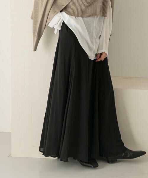 空気を含んだようなフレアシルエットが魅力的なマキシスカート。切り替えを施すことでボリュームを抑え、大人っぽい雰囲気に仕上げました。ウエストがオールゴムになったストレスフリーな穿き心地も嬉しいポイント。組み合わせるトップスによって雰囲気を変えられる万能さが魅力の1着。大人っぽさを演出するカラーリングにも注目です。