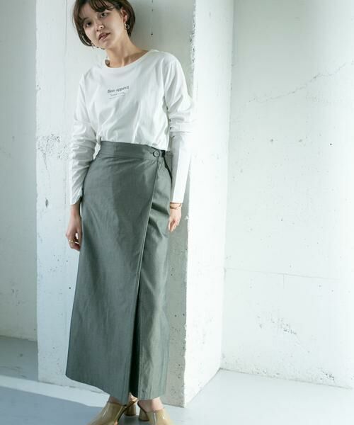ラップスカートのように大きなタックが印象的なロングスカート。角度によって色の見え方が変わって見えるシャンブレー生地を採用しており、一枚で二度楽しめるアイテムです!ゴム無しのワンサイズ展開ですが、ボタンのかけ位置でウエストサイズを調節できるのも嬉しいポイント◎