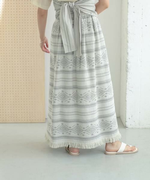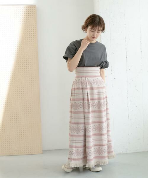 オリジナルエスニック柄のボリュームスカート。ハイウエストで腰の位置が高く見え、スタイルアップが叶います。裾がフリンジになっているのでエスニックなムードも感じられて◎シンプルなトップスを合わせるだけでサマになるデザインが嬉しいですね。
