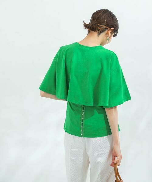 マント&ホックのバックデザインが特徴的なTシャツ。ホックが施されることで、フロントから見るとウエストがシャープしたシルエットになりスタイルアップが叶うアイテム。ベーシックなCREAMと、夏らしい鮮やかなPURPLEPINK、GREENをご用意しました。