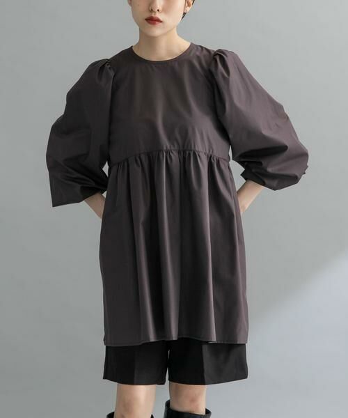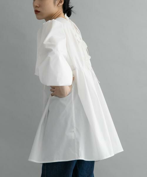 さらっとしたシャツ地を使用した、BACKリボンデザインが女性らしいチュニック。二の腕カバーが期待できる袖のボリューム感や、スタイルアップ可能な胸下切り替え仕様もポイントです。女性らしいディテールが詰まったアイテムながらも、素材で少し甘さを抑えました。フレアデニムやスラックスを合わせたバランスの良い着こなしや、ショートパンツでミニワンピース風にしたスタイリングもおすすめです。