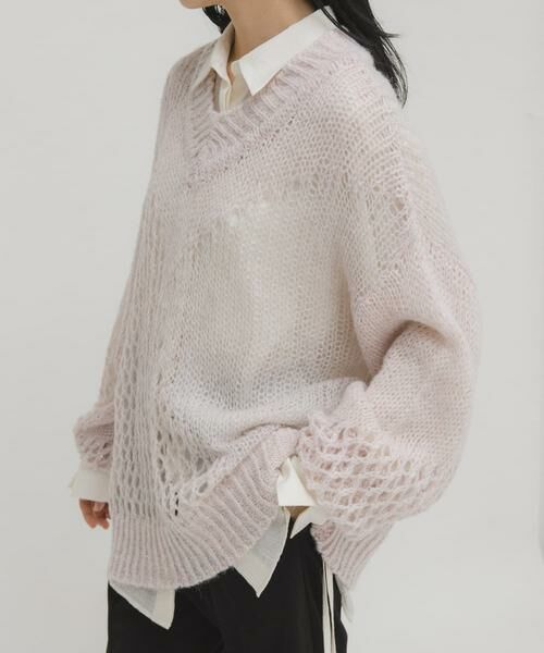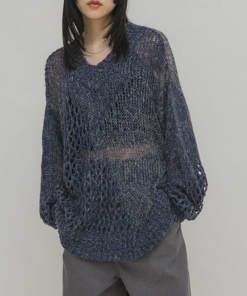 トレンドのスパンコールの糸を使用したニットが登場。異なった編み方を3種切り替えたデザインになっており、抜け感をプラスしてくれるVネック開きもポイントです。ロゴTEEやシャツの上からレイヤードするだけでこなれ感が増すアイテムです。