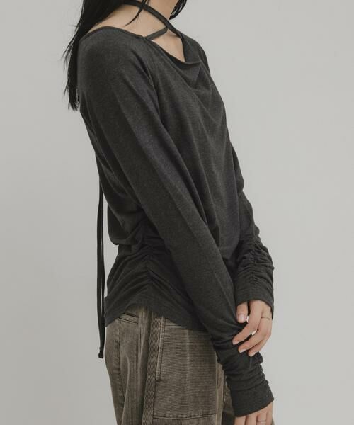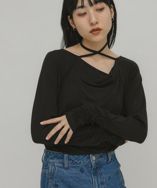 襟元に設定された共紐がポイントのデザインカットソー。レディさもありつつ、モード要素も兼ね備えた胸元のドレープ仕様や、くしゅっとした袖もポイントです。襟元の紐はぐるりと巻いてチョーカーのようにしたり、後ろでリボン結びしたり楽しめます。メイン使いはもちろん、ジャンパースカートのインナーにもおすすめです。