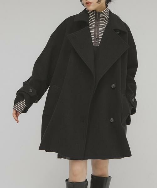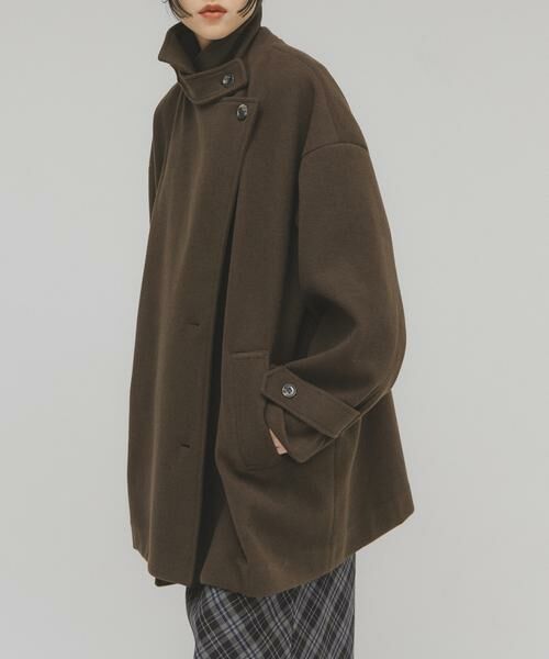 BIGカラー仕様が顔周りを華やかに仕上げるアウター。衿に釦が設定されているので、スタンドカラーとしても着用可能です。また、後ろに大きなタックが入っており、ウエストのタブもポイントになっています。袖は調整可能な釦付きになっており、小さくすると少し丸みが出ます。程よくリラックスしたシルエットと、腰回りがカバーできる絶妙な丈感は、パンツやスカートどちらにも合わせやすいです。