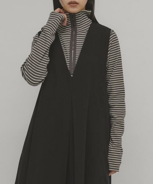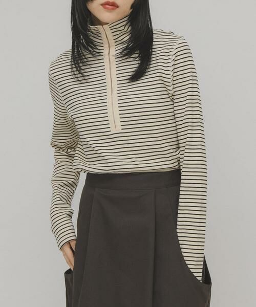首元のホック開きが特徴的なボーダートップス。ホックは全て閉じてタートルとして着られるだけでなく、少し開き襟のようにしても雰囲気が変わるのでおすすめです。着心地の良い綿を含む素材も嬉しいポイント。メイン使いのみならずインナーとしても重宝するアイテムです。