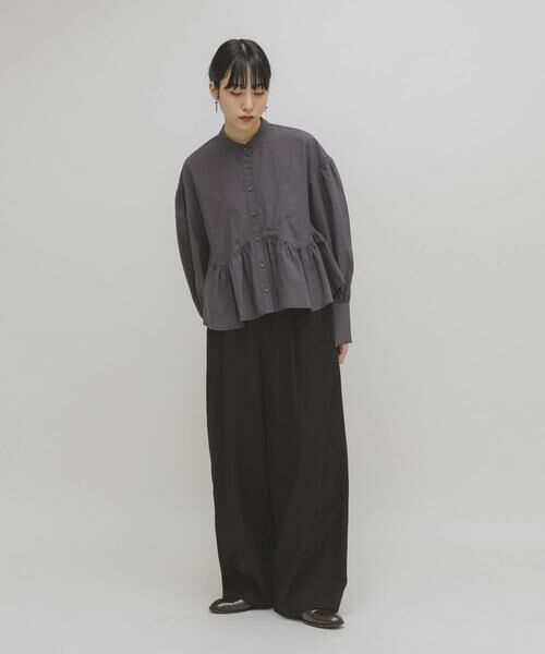 フォルム感が出る素材を使用したブラウス。首元はすっきりとした印象に仕上げ、切り替え部分はアシンメトリーデザインにしました。フェミニンなアイテムからきれいめコーデまで幅広いアイテムに合わせられます。