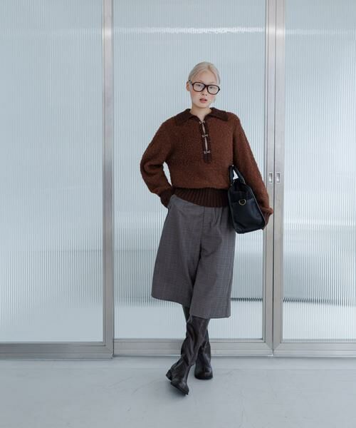 くりんとした編地と、フロントホックがアクセントになったニット。全体的に甘さのある編地ながらも、ポロ型にすることでカジュアルさをプラスしました。フロントホックを開けて着ていただくと、首回りがすっきり見え、抜け感を演出します。また、少し短めに設定された着丈は腰でしっかりと留まるリブ仕様になっており、自然と丸みのあるシルエットになるところもポイントです。