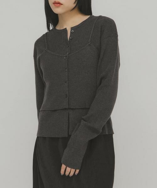 肌触りの良い素材を使用したクルーネックカーディガンと、取り外し可能なビスチェがセットになったお得なアイテム。フィット感がありつつも、肩やアームホール、バストラインにかけて少しゆとりを持たせました。セット使いはもちろん、別々でも使用いただけるので、様々な着こなしが楽しめます。