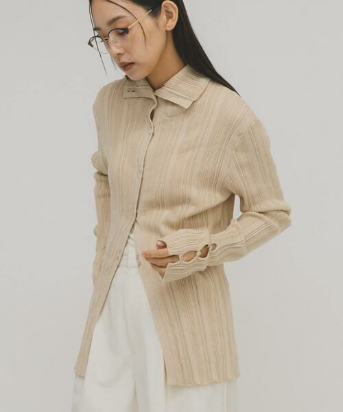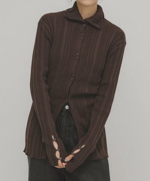 すっきりとした着こなしとフィット感のあるランダムリブを使用したニット。フロントの釦が特徴的で、裾のスリットは抜け感をプラスします。ハイネック仕様ながらも、釦を外すと表情が変わるのもポイント。ベーシックに見えながらも一癖のあるデザインが存在感を放つ1着に仕上げました。