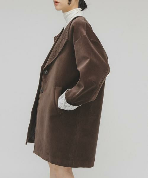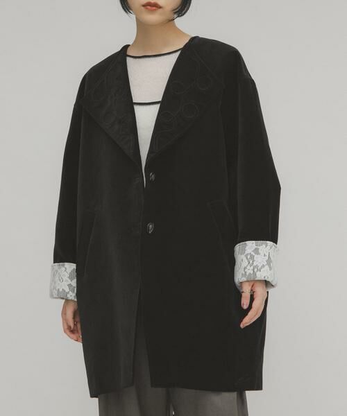 シーズンムード高まるベロア素材を使用したBIGジャケット。胸元の立体ステッチが特徴的で、袖口は2WAYになっており、折り返すとヴィンテージライクなレースが現れます。腰回りまでの長さがあり、程よく厚みがあるので防寒も叶えるアイテムです。
