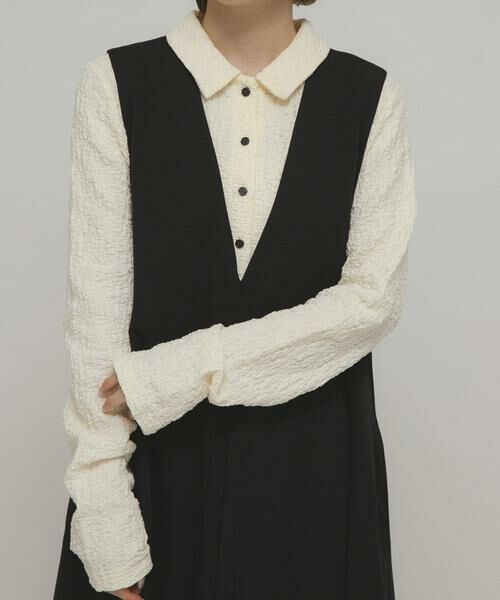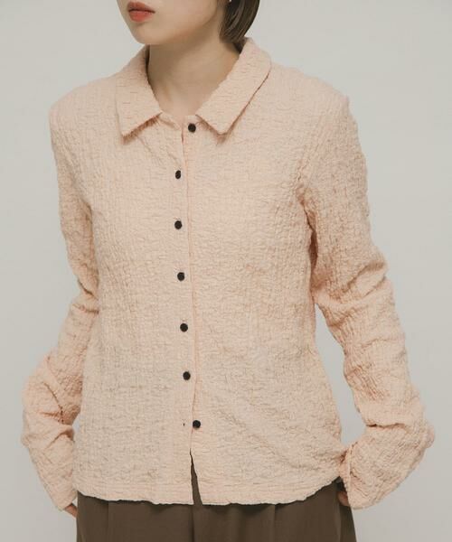 ポコポコとした素材感がポイントになったカットソーシャツ。程よくフィット感のあるサイジングで、裾の釦を開けて着ていただくと自然と抜け感が演出できます。ボリュームのあるボトムやコクーンパンツと相性良く合わせていただけます。