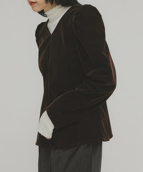 ボリューム感のあるパフスリーブや、少しウエストシェイプされた身頃が女性らしいベロアブラウス。しっかりとした素材ながらもストレッチが効いているので着心地がいいです。フロントは華奢なホックデザインになっており、アウター感覚でも着ていただけます。