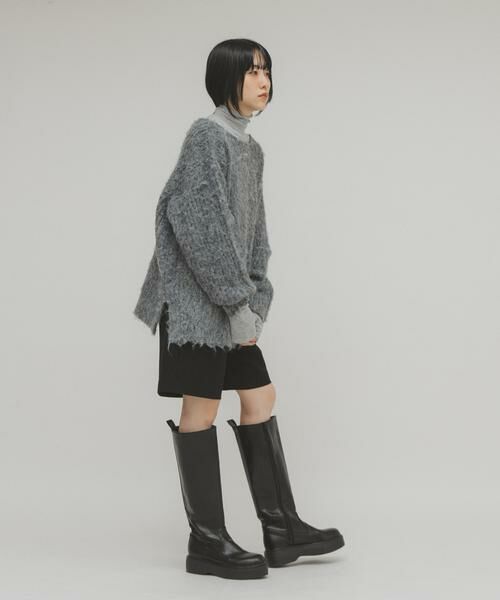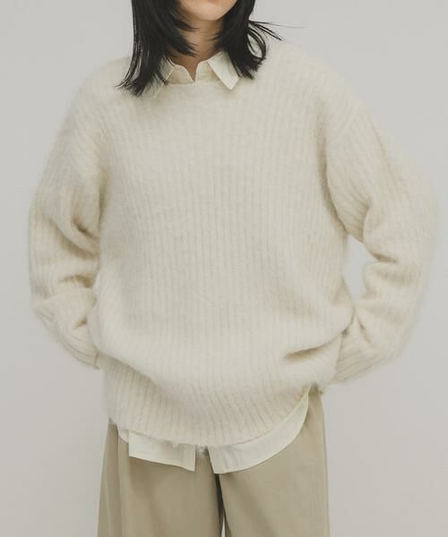 ふわふわとした表面と柔らかな着心地が嬉しいフェミニンなニット。シャギーで膨れて見えがちですが、リブ編みにすることで縦ラインが強調され、且つ襟元はボートネックで女性らしい抜け感を演出します。腰回りまでカバーする丈感や締め付けのないシルエットもポイントです。
